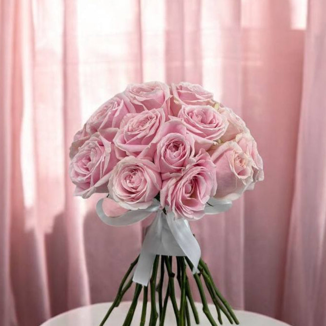 A timeless bouquet composed entirely of delicate pink roses, symbolizing admiration, joy, and gentle affection. Its uniform design and graceful form create an effortlessly romantic statement — soft, elegant, and full of warmth. Perfect for brides who love classic beauty and refined simplicity, this bouquet embodies pure romance in its most graceful form.