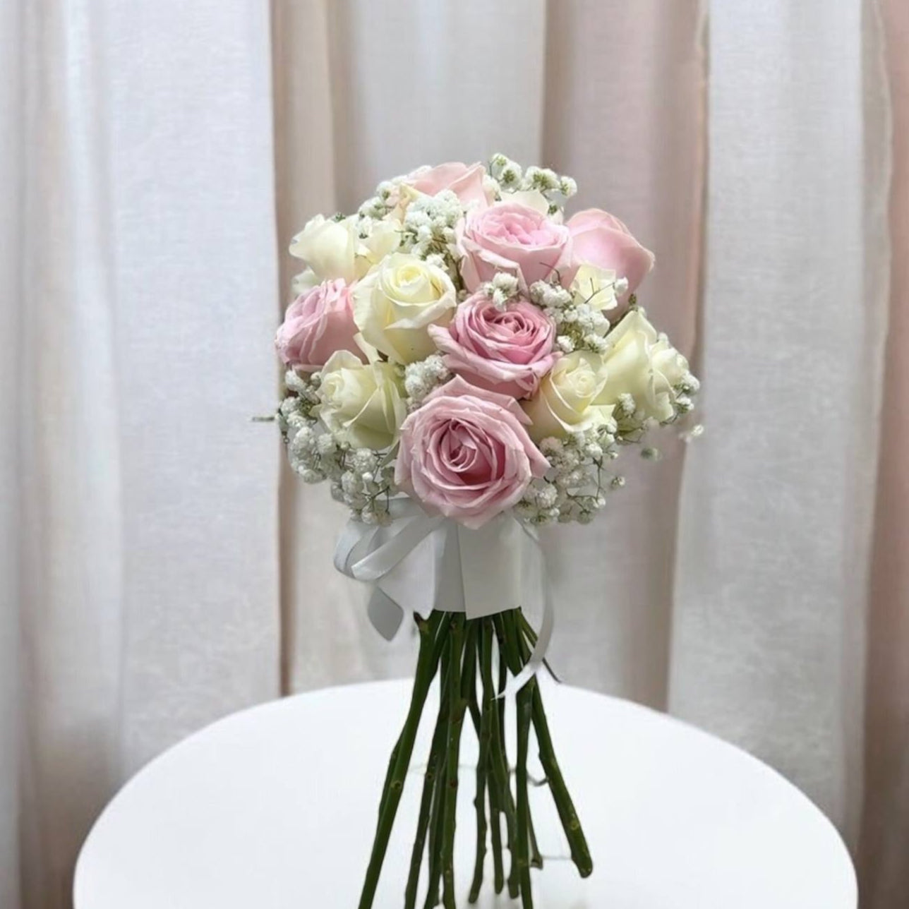 A graceful bouquet that blends blush pink roses with baby breath. The soft pastel tones capture innocence and love, while the tulips symbolize new beginnings and joy. Elegant and feminine, this bouquet is perfect for brides who adore a light, airy arrangement that feels both modern and timeless.