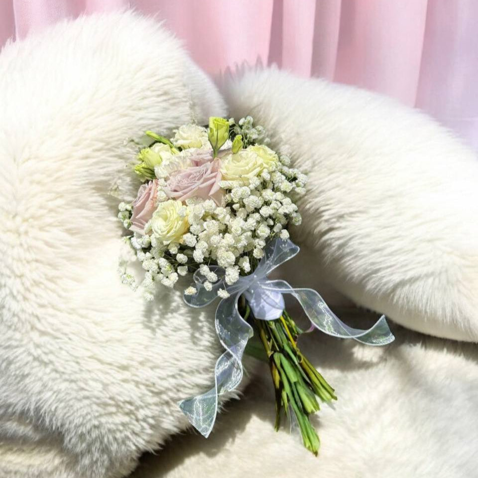 Indulge in the elegance of Dusk. Our handcrafted bridal bouquet features the delicate beauty of Menta Roses, Eustoma, and Baby's Breath. Each flower is carefully chosen to create a stunning arrangement fit for your special day. Elevate your wedding with the luxurious touch of Dusk.