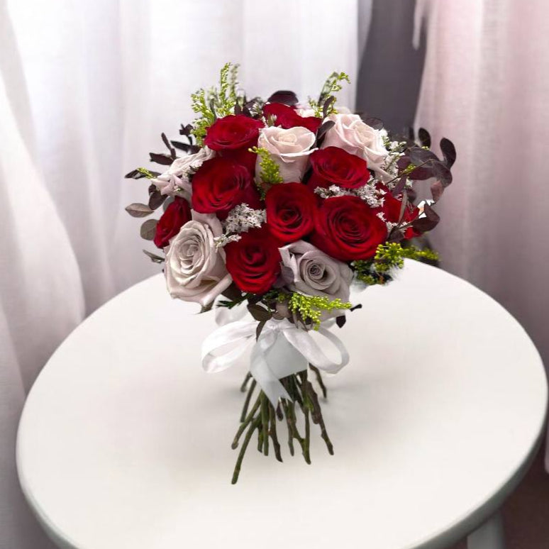 A captivating bouquet that intertwines the intensity of red roses with the soft allure of dusty mauve and ivory tones. Accented with deep foliage and delicate filler blooms, this arrangement embodies passion, elegance, and depth. Ideal for brides seeking a modern romantic look that balances bold emotion with refined beauty.