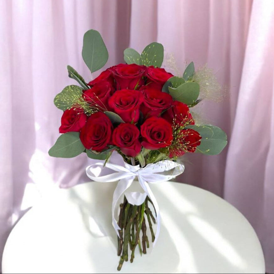 A classic symbol of everlasting love and passion, this bouquet features a lush cluster of velvety red roses accented with fresh greenery. Elegant and full of emotion, it captures the essence of timeless romance — perfect for brides who wish to make a confident, heartfelt statement on their special day.