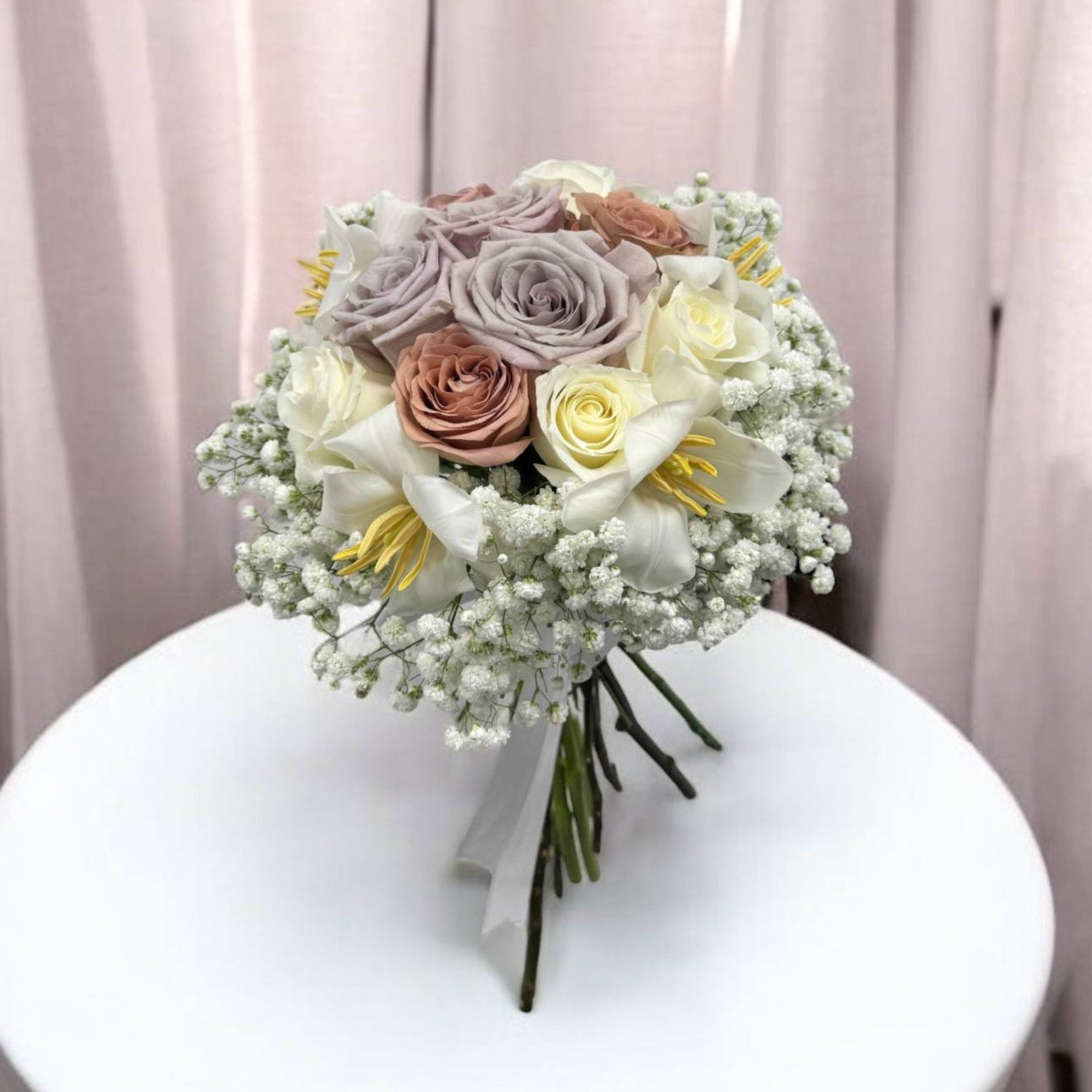 A soft yet striking arrangement that blends mauve, ivory, and champagne roses with delicate white tulips and baby’s breath. The tulips add a touch of purity and new beginnings, while the roses convey love and devotion. Framed by airy baby’s breath, this bouquet embodies understated elegance — perfect for brides who seek a graceful balance of romance and sophistication.
