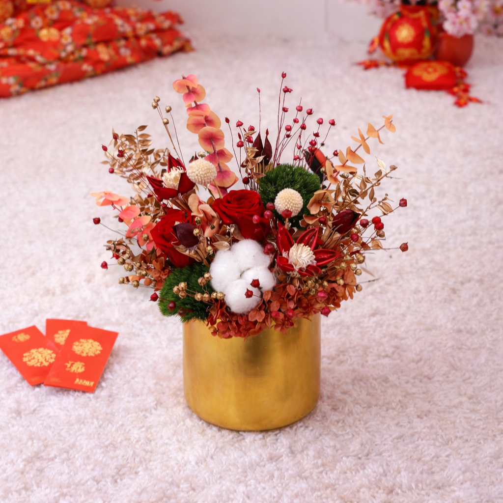 A sleek matte gold cylinder vase filled with preserved red roses, cotton blooms, moss accents, dried hydrangeas, and festive foliage. The combination of deep reds and natural textures creates a bold yet refined centrepiece.