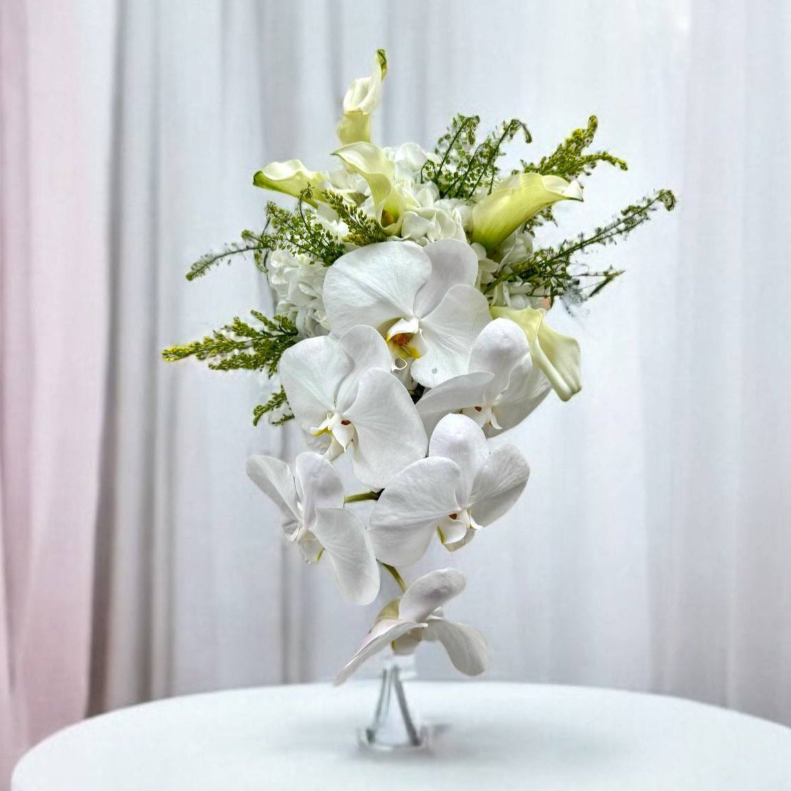 An elegant symphony of form and flow, this bouquet combines cascading white orchids with graceful calla lilies and soft greenery. The sleek silhouette evokes modern sophistication, while the white palette symbolizes purity and everlasting love. Perfect for the refined bride seeking a timeless yet contemporary arrangement that exudes poise and serenity.