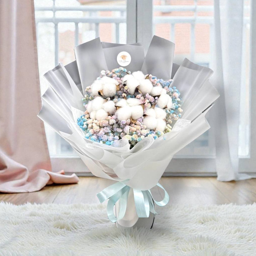 This elegant bouquet features fluffy Cotton blooms complemented by delicate Baby's Breath. Its minimalist and natural charm exudes a sense of purity and tranquility, making it a perfect gift for expressing warm wishes, celebrating milestones, or adding a touch of sophistication to any occasion.