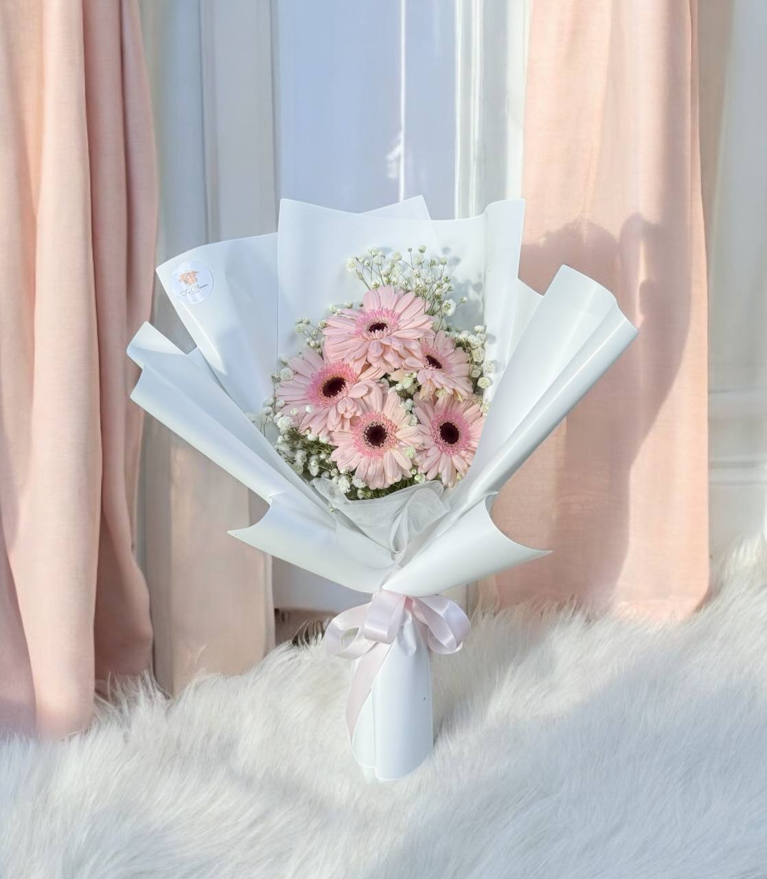 A stunning bouquet of light pink Gerbera flowers. Each bloom has been hand-selected for its vibrant hue and delicate petals, creating a truly luxurious and exclusive arrangement. Perfect for any occasion, Petra will add a touch of elegance and sophistication to any space.