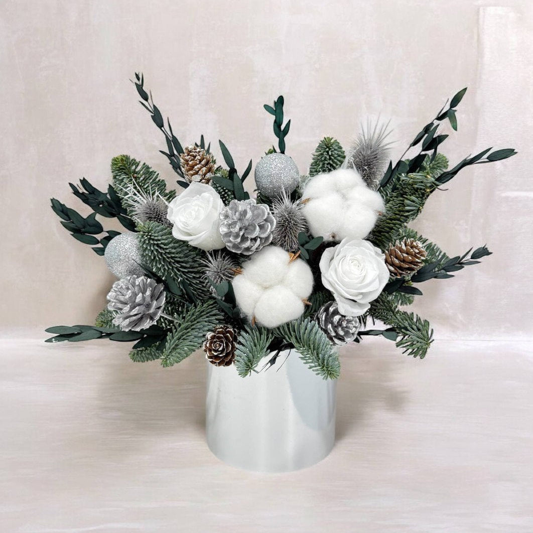 A festive Christmas floral arrangement featuring white roses, cotton blooms, silver pinecones, and lush evergreen foliage in a silver bloom box. Perfect for gifting or adding a touch of holiday elegance to your home. Ideal for Christmas décor, corporate gifts, and year-end celebrations.