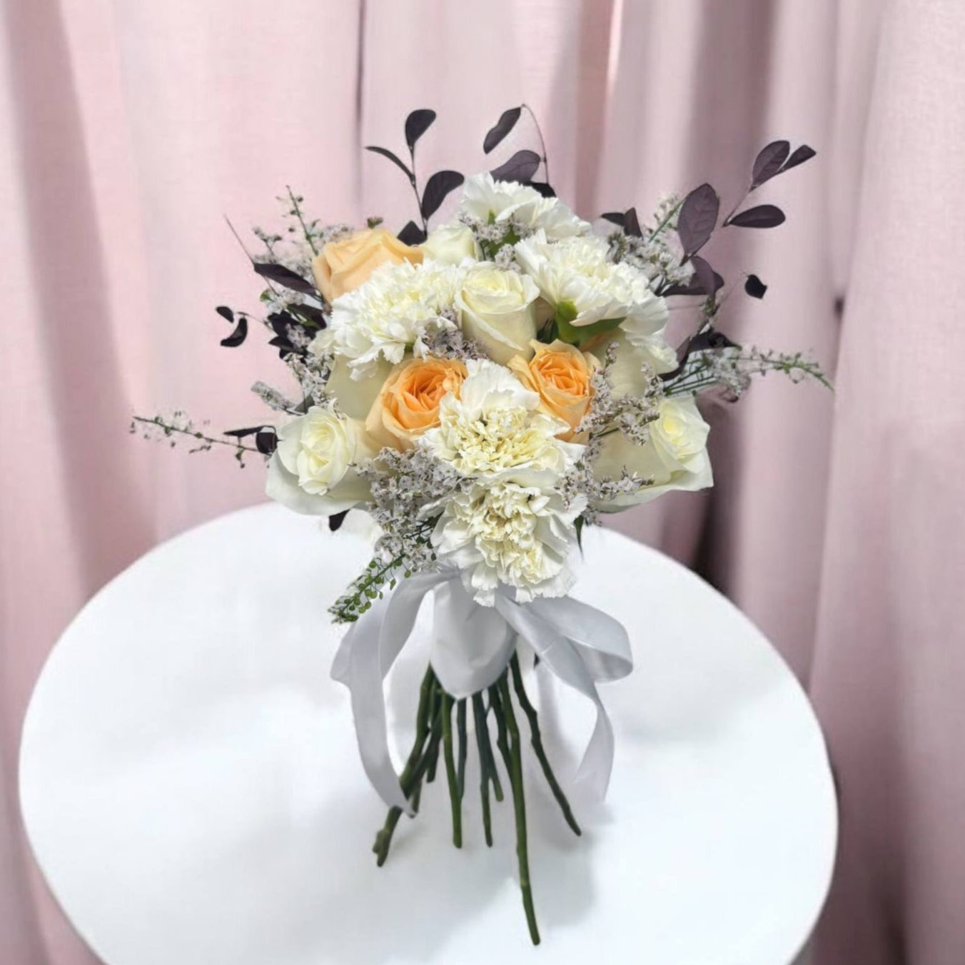 A bouquet that exudes modern poise and quiet charm, combining ivory and peach roses with creamy carnations and delicate filler blooms. The dark foliage adds depth and contrast, creating a balanced composition of warmth and sophistication. Perfect for brides who appreciate a subtle blend of classic romance and contemporary elegance.