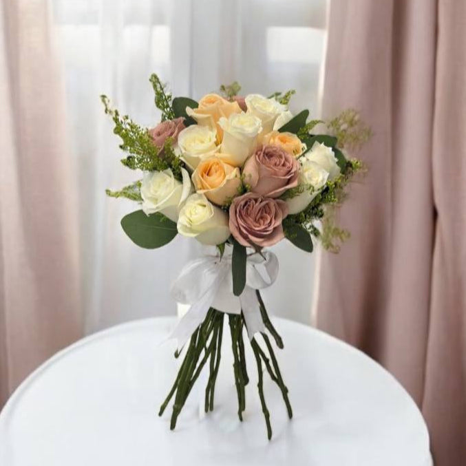 A bouquet that captures warmth and serenity, featuring a delicate mix of champagne, ivory, and dusty rose blooms. The harmonious blend of colors symbolizes sincerity, gratitude, and enduring love, creating a naturally radiant arrangement that feels both classic and contemporary. Perfect for brides who appreciate understated beauty and soft romantic tones that complement any wedding palette.